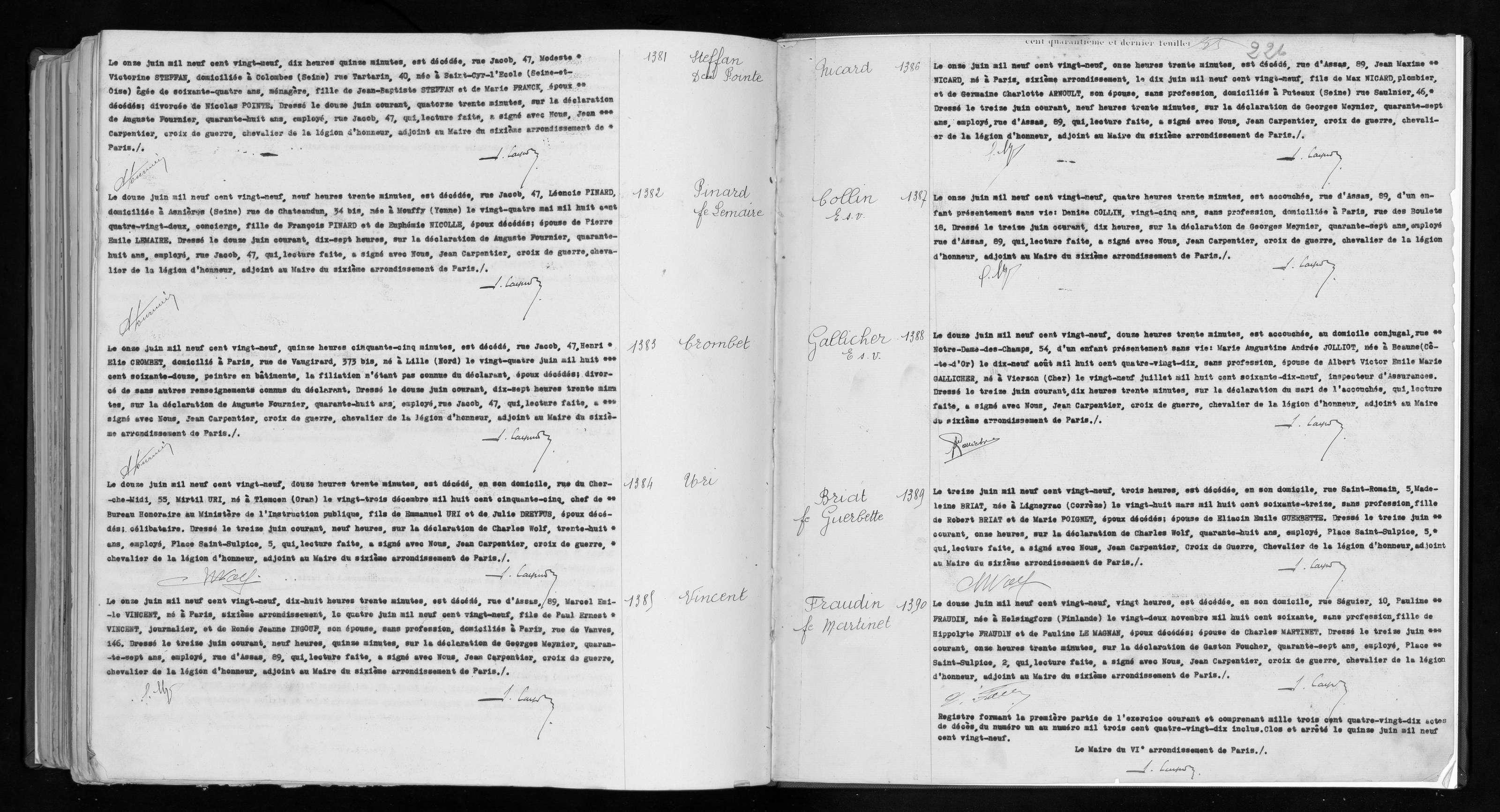 Marie Poignet, époux décédés ; épouse de Eliacin Emile Guerbette. Dressé le treize juin courant, onze heures, sur la déclaration de Charles Wolf, quarante-huit ans, employé, Place Saint-Sulpice, 5e qui, lecture faite, a signé avec Nous, Jean Carpentier, Croix de Guerre, Chevalier de la légion d’honneur, adjoint au Maire du sixième arrondissement de Paris.